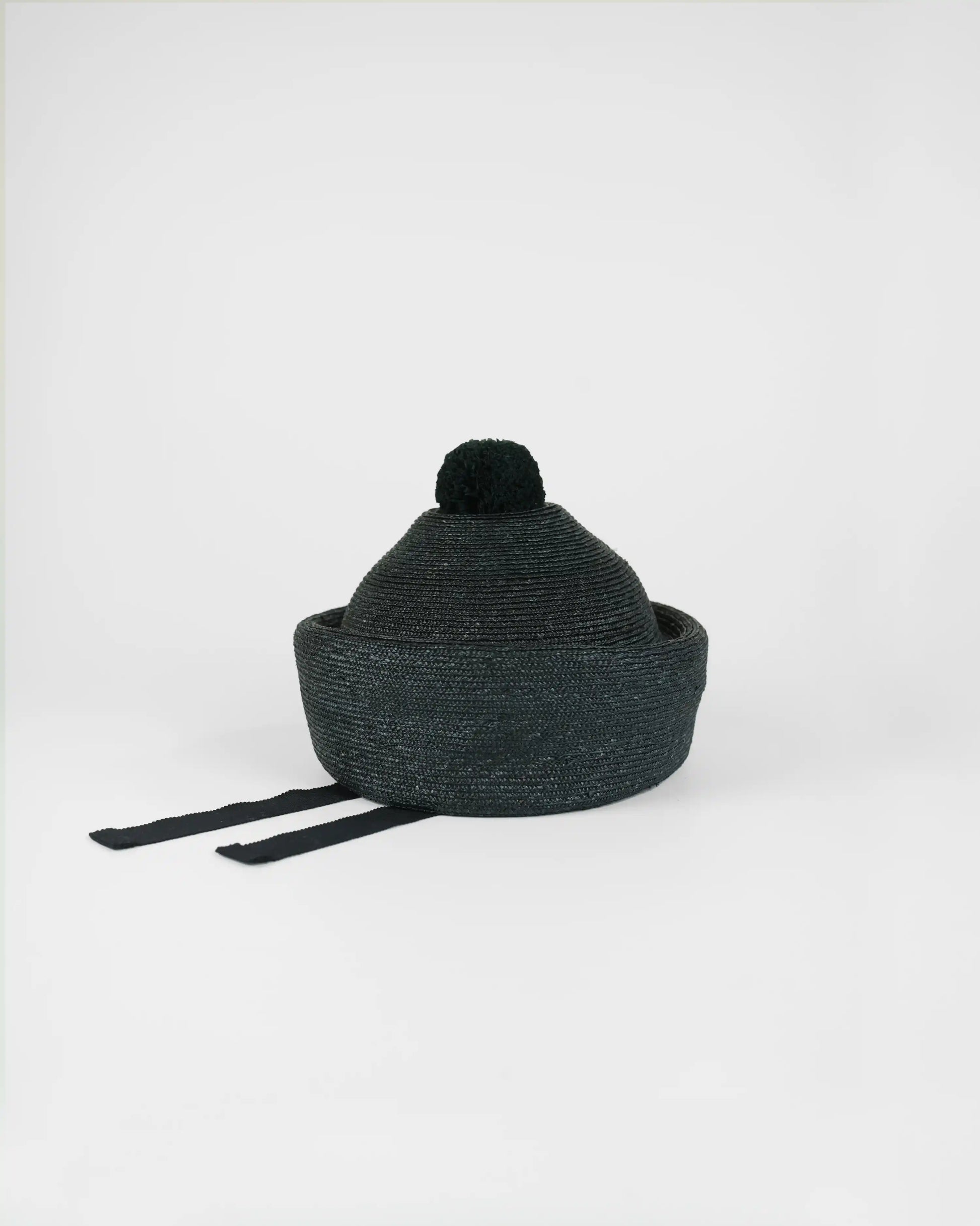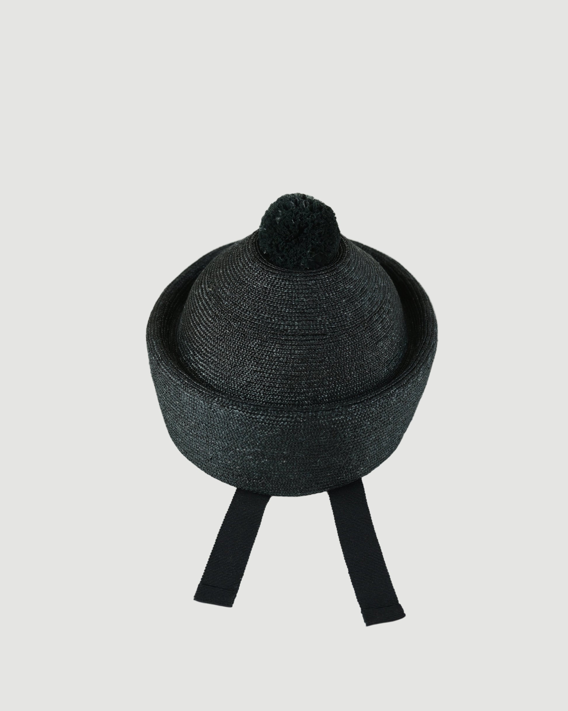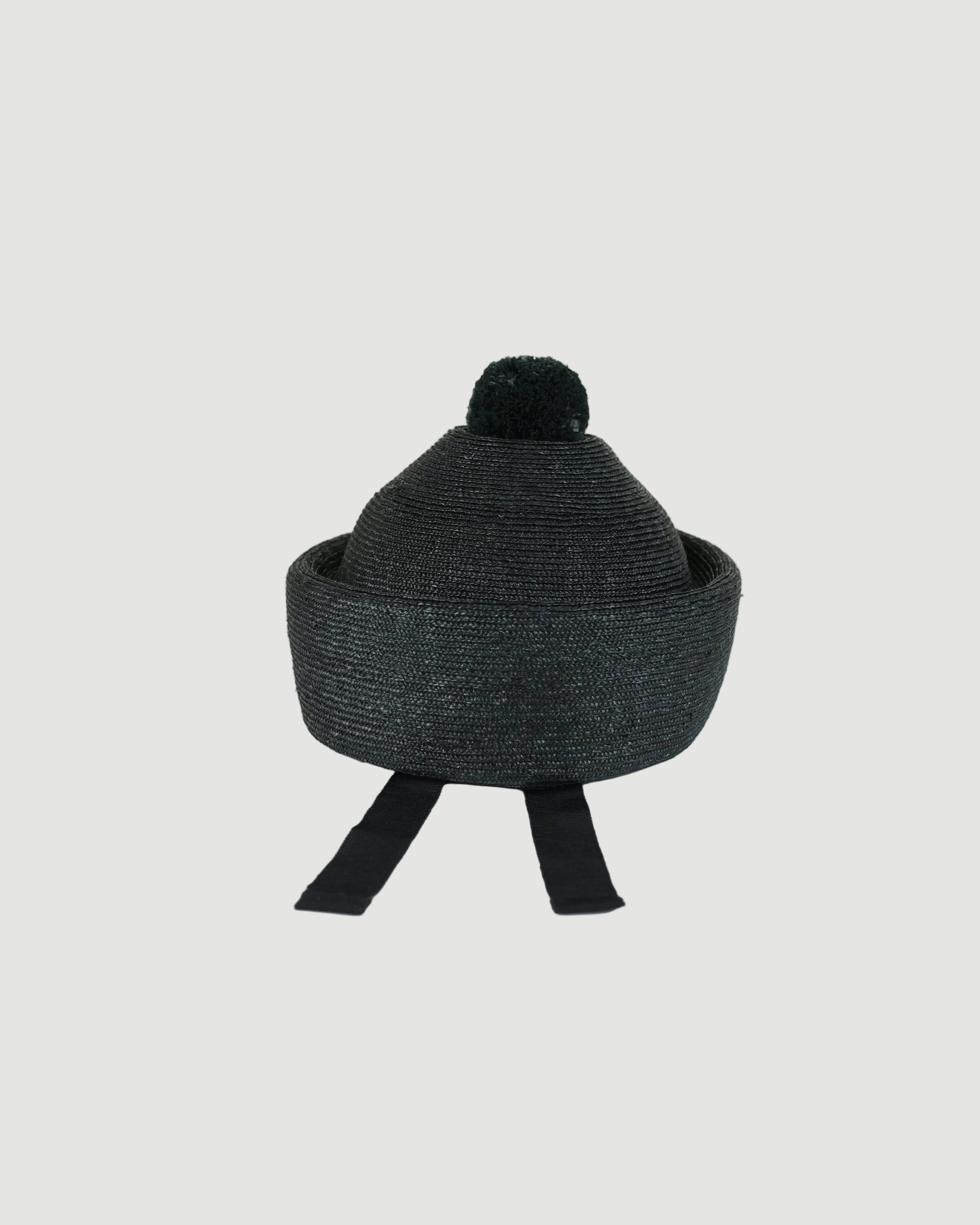 Crafted from fine black wheat straw braid and accented with a black raffia pompom, it adds a striking, sculptural element to any outfit. Perfect for elevating your evening wear or making a statement in your everyday look.
