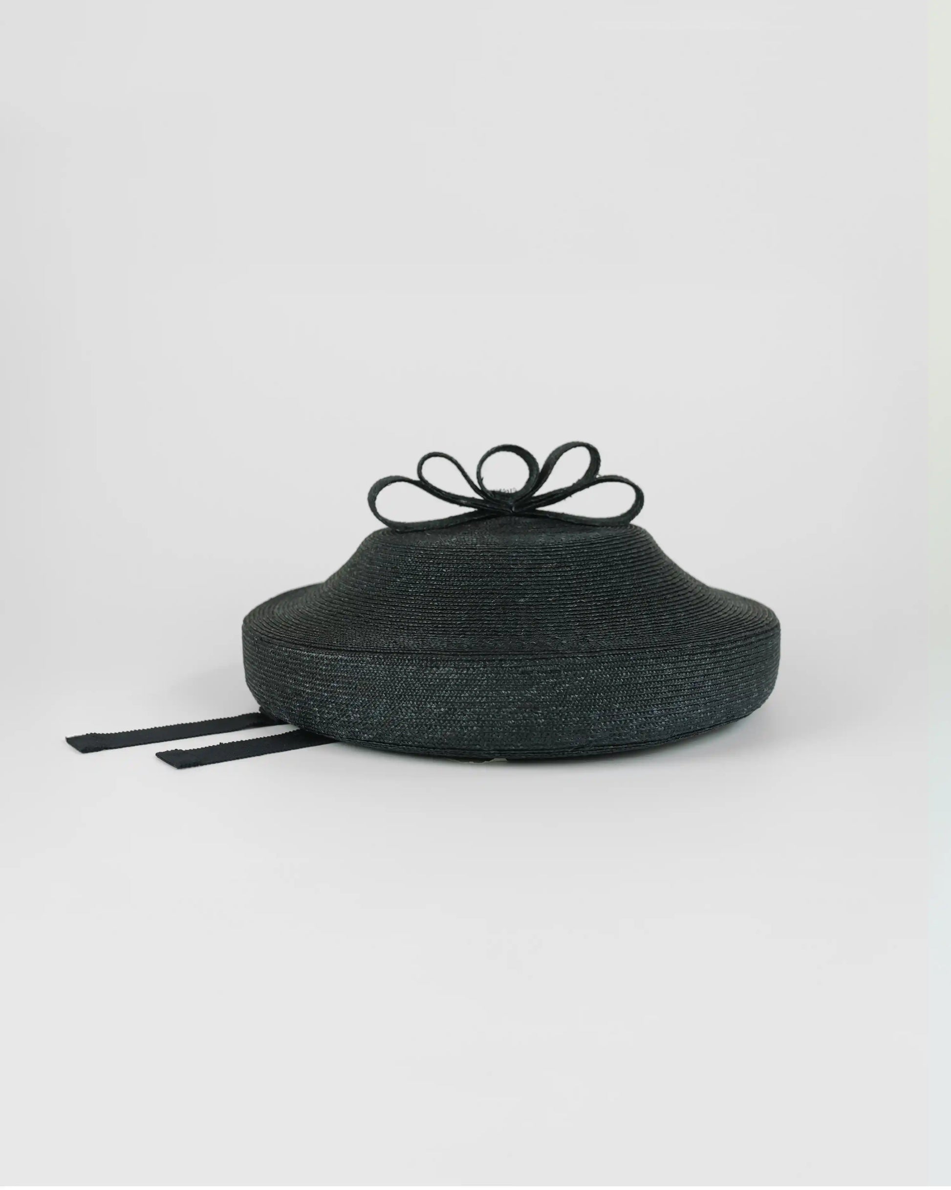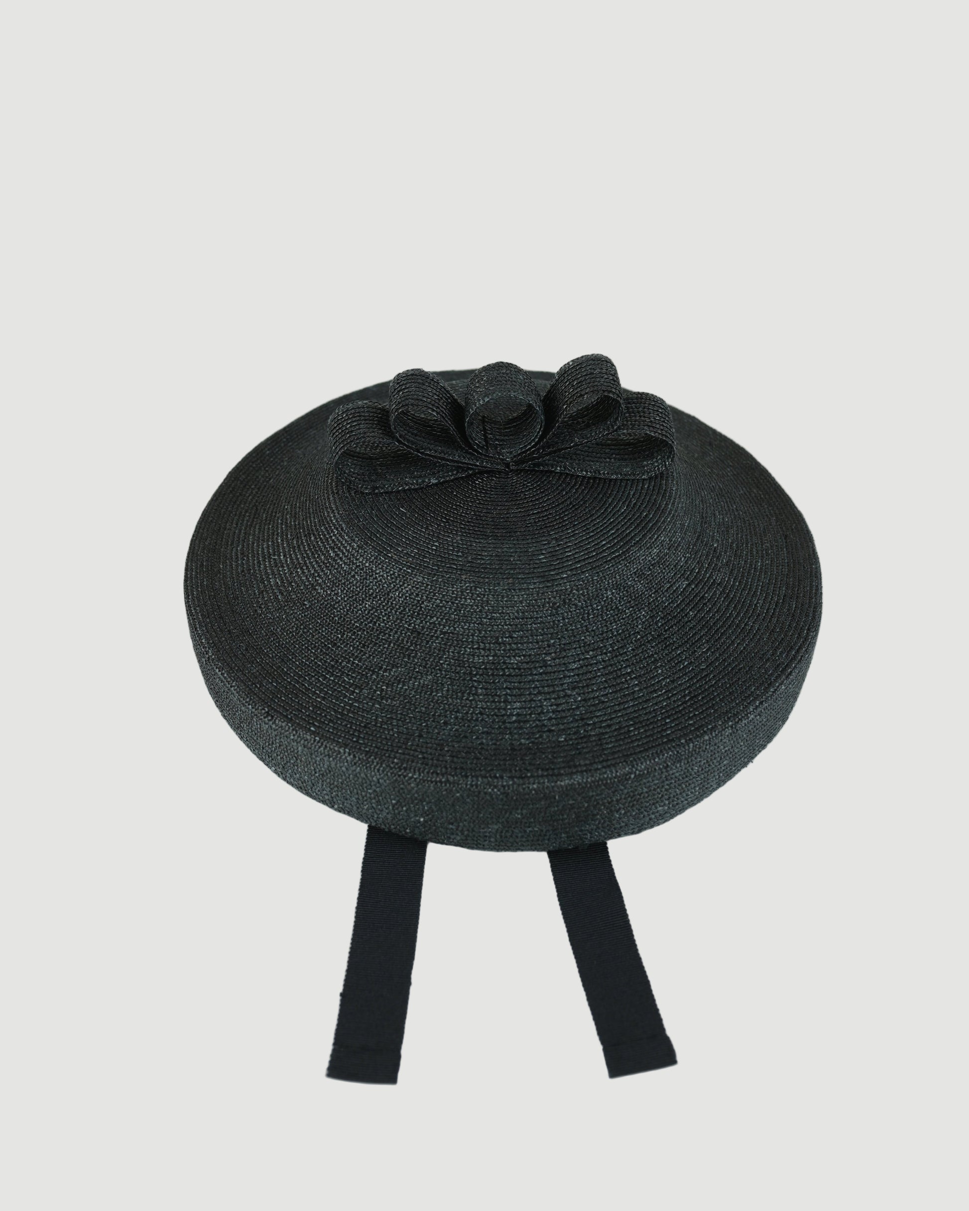 Sewn from fine black straw braid and accented with a hand-stitched abstract bow, it captivates with its three-dimensional design and feels more like an art object than mere headwear.Featuring long cotton ribbons that can be secured under the chin or left to hang freely, adding a stylish and effortless touch that perfectly complements your outfit.