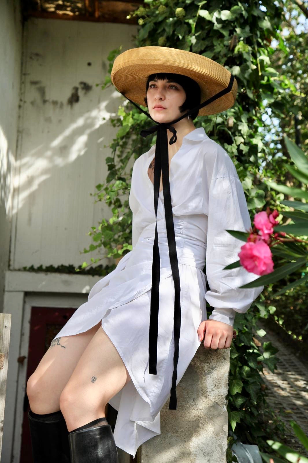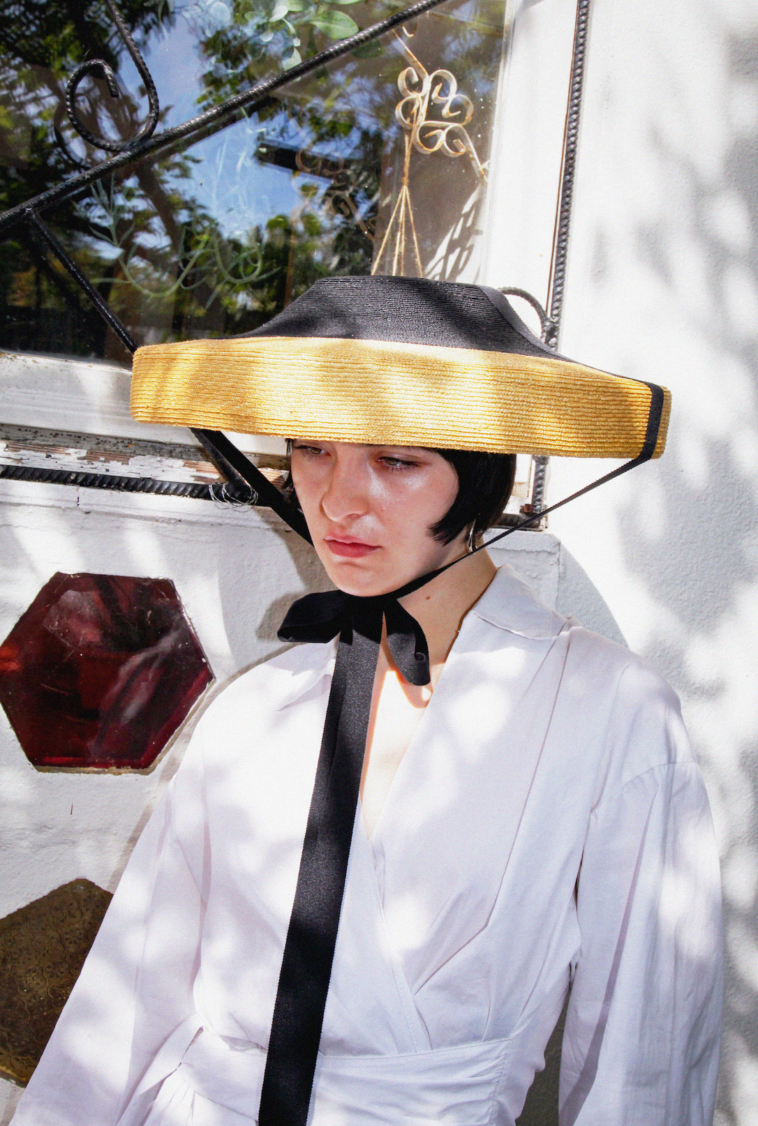 Its unique feature is the double brim, hand-stitched with care. The hat is truly exceptional, giving a completely new interpretation to the classic sun hat. A wearable work of art.